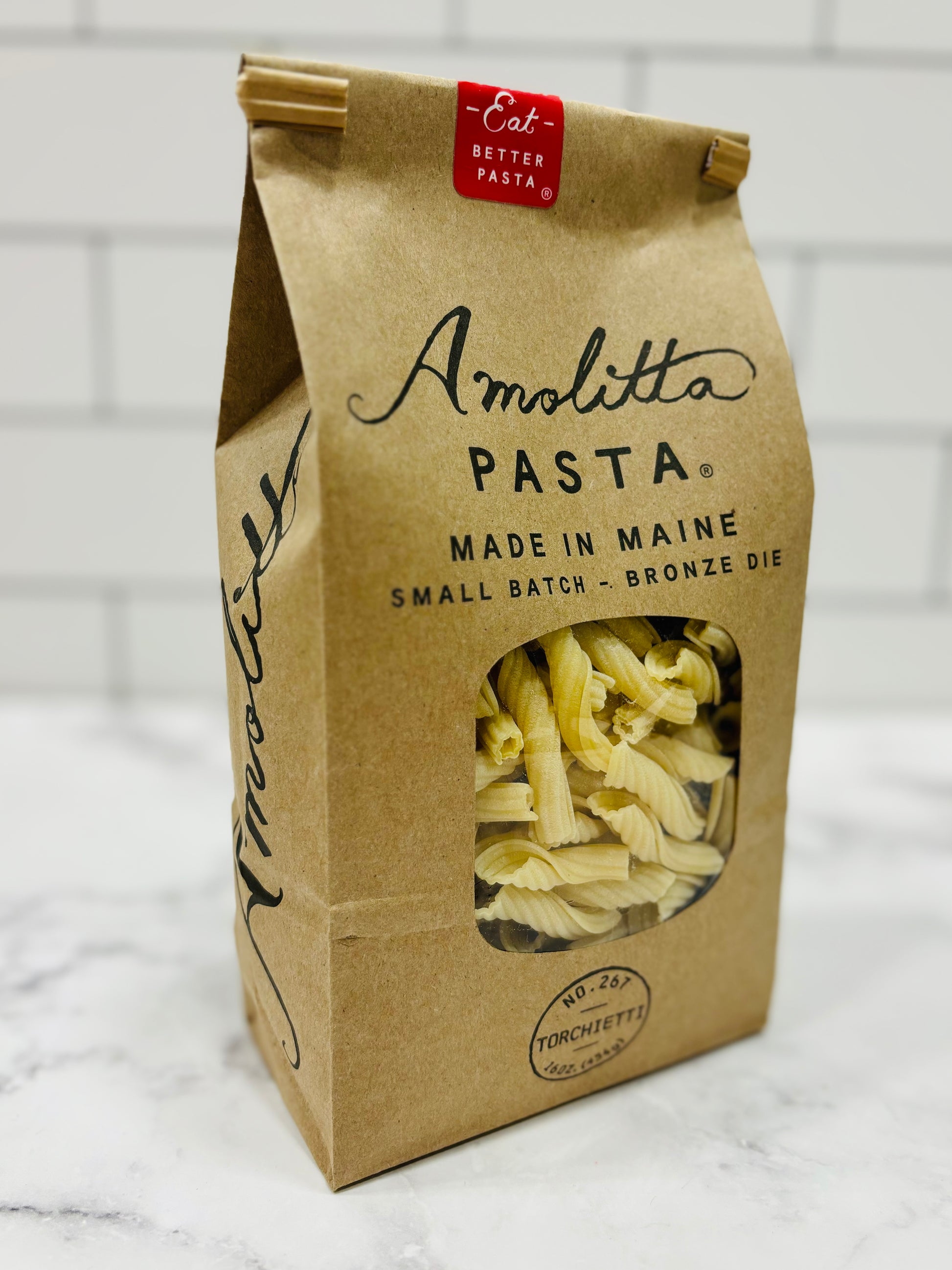 Torchietti is originally from the Campania region in Italy. The name Torchietti means little torches in Italian. It is so good and so versatile. Pair it with tomato sauce, Roman alla Gricia (basically a pasta dish with cheese, pepper, and guanciale or pancetta), meat or fish. Chicken, broccoli, and pesto is a favorite. Each bag has 16 oz. of pasta. Our pasta is made with durum semolina wheat grown in the USA, which contains gluten, and is non-GMO. Economy ground shipping included.